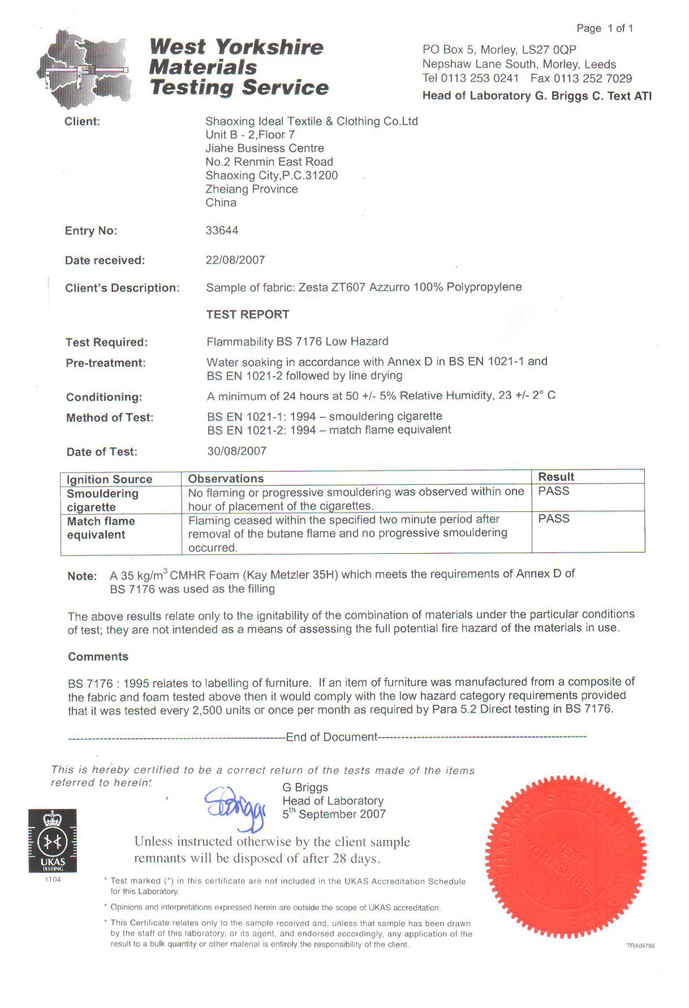 | Flammability: | BS EN 1021-1:1994 (Cigarette) BS EN 1021-2:1994 (Match) BS 7176:1995 Low Hazard Flammability performance is dependent on the combination of material used. |