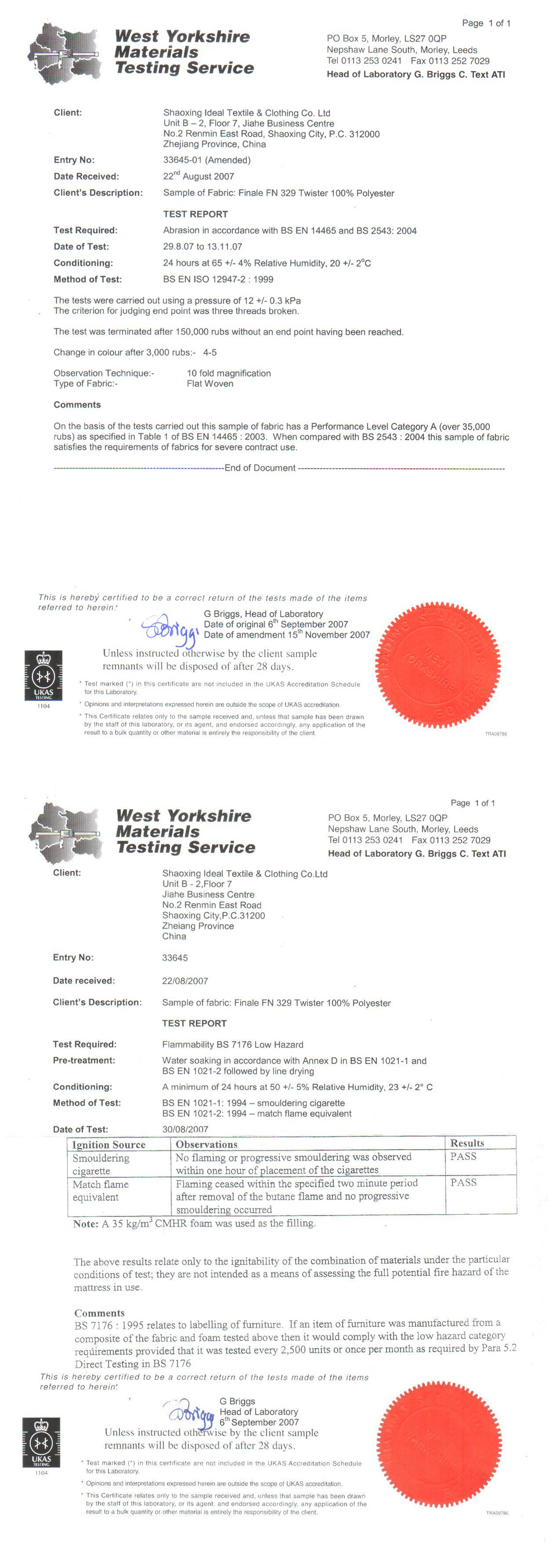 | Flammability: | BS EN 1021-1:1994 (Cigarette) BS EN 1021-2:1994 (Match) BS 7176:1995 Low Hazard California TB 117 Section E Flammability performance is dependent on the combination of material used. |
