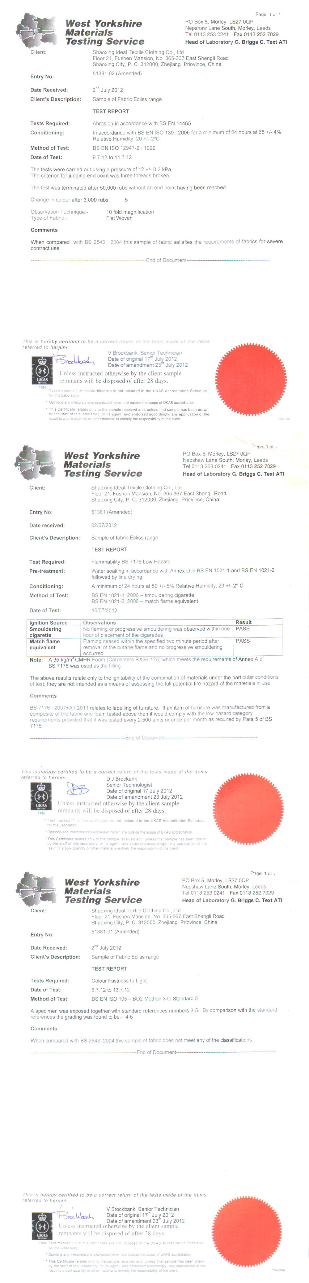 | Flammability: | BS EN 1021-1:1994 (Cigarette) BS EN 1021-2:1994 (Match) BS 7176:1995 Low Hazard California TB 117 Section E Flammability performance is dependent on the combination of material used. |