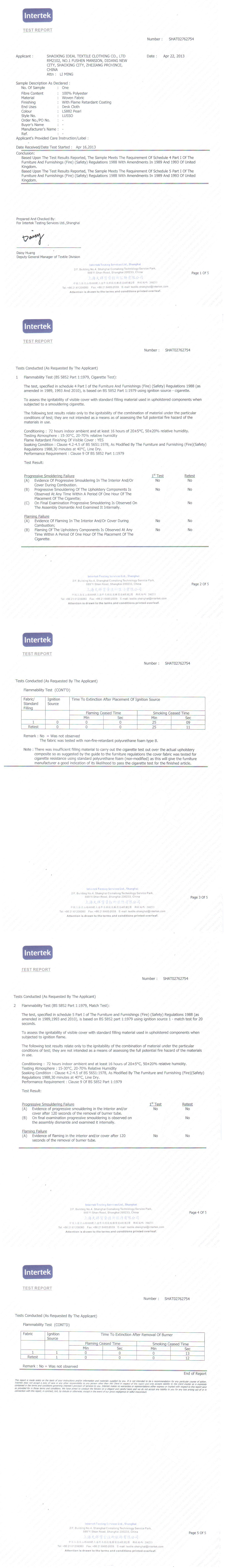 | Flammability: | BS EN 1021-1:1994(Cigarette) BS EN 1021-2:1994(Match) BS 7176:1995 Low Hazard BS 476 Part 7 Class 1 California TB 117 Section E |