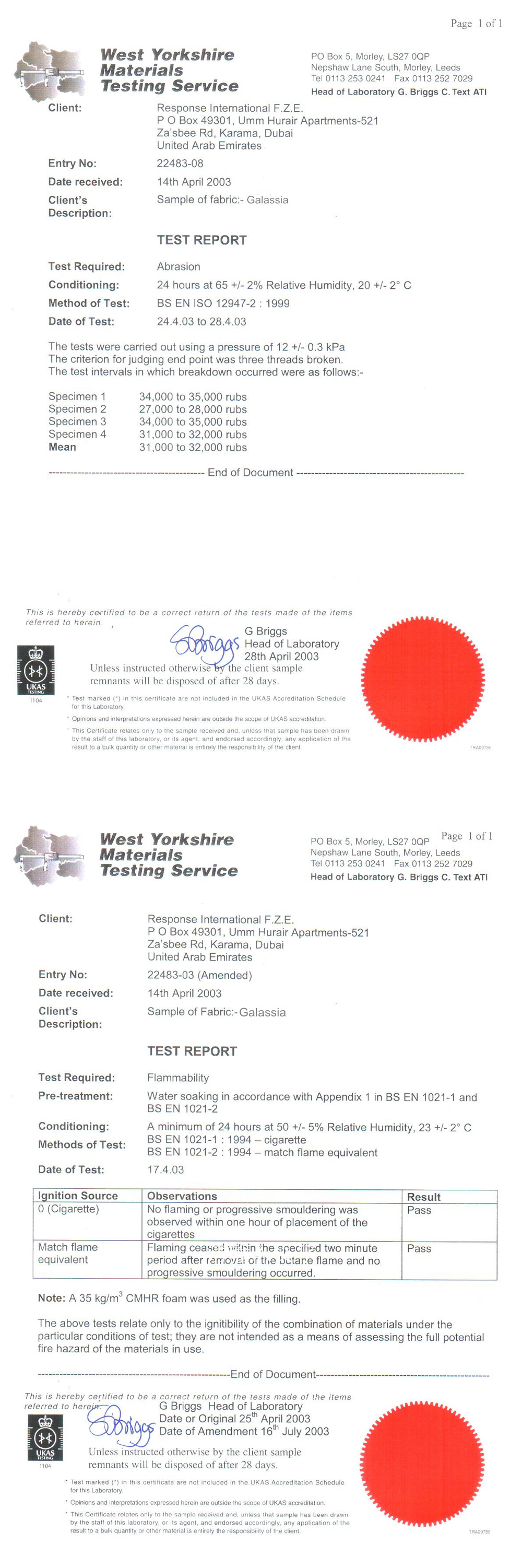 | Galassia | GJ | Polyester-Cotton | 35,000 | 152cms/60" | 240gm2(365g/Lin.m) | Pass | Pass | Pass | Pass | |