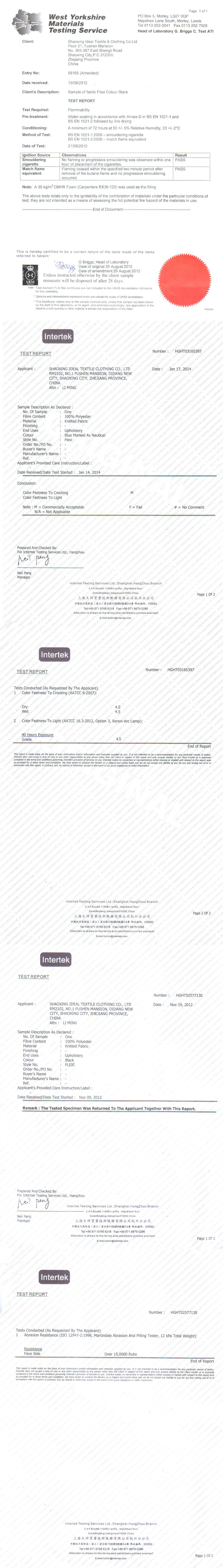 BS EN 1021-1:1994 (Cigarette) BS EN 1021-2:1994 (Match) BS 7176:1995 Low Hazard BS 476:Part 7: Class 1 California TB 117 Section E Flammability performance is dependent on the combination of material used. |